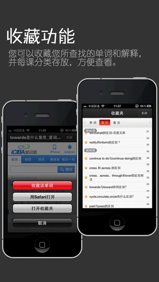 15、提供收藏功能,您可以收藏您所查找的单词和解释,并按课文分类存放,方便查看。