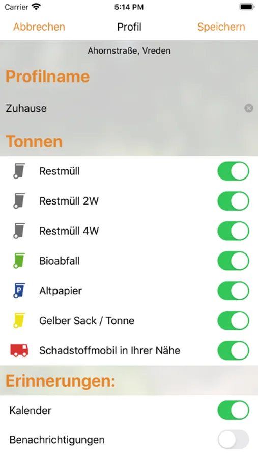 Bei der Profileinstellung wird ebenfalls festgelegt, ob das Smartphone an die bevorstehenden Abfuhrtermine über die Lokale Benachrichtig und / oder über den Kalender erinnert. Außerplanmäßige Terminänderungen werden in beiden Fällen berücksichtigt.