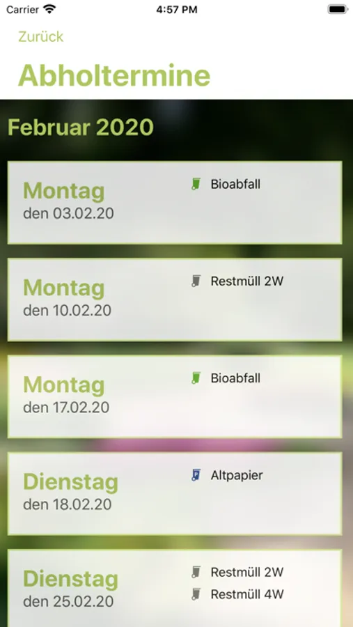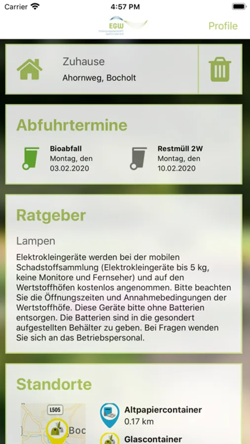 Welcher Wertstoff kann wann, wo und wie entsorgt werden? Die abfallapp ermöglicht den schnellen Zugriff auf die individuellen Abfuhrtermine. Sie werden an alle Termine für maximal fünf Standorte nach vorheriger Einstellung erinnert. Im Profil werden die persönliche Standorte ausgewählt. Über einen Schieberegler wird eingestellt, über welche Abfuhrtermine eines bestimmten Wertstoffes informiert werden soll.