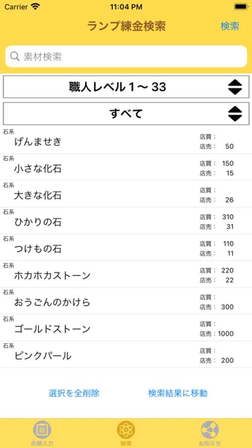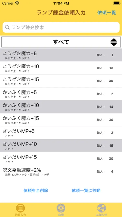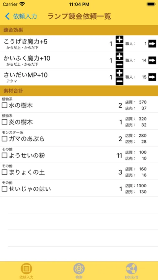 ・登録したランプ錬金の合計素材(レシピ)を確認