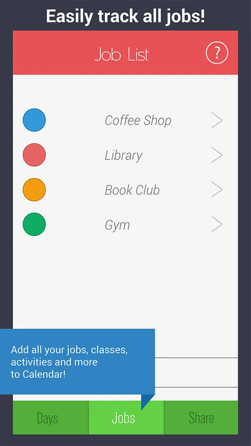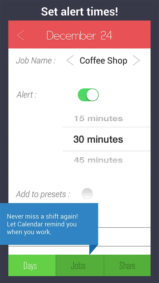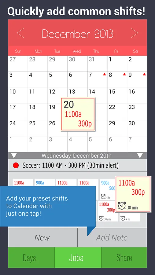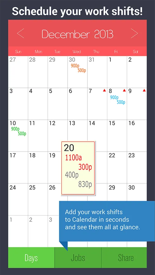 Try Calendar today. The basic version lets you add unlimited shift start times for any one job. If you like it, go professional with Calendar Pro - and track full shift lengths, hours worked, wages earned and full alarm capabilities for an unlimited number of jobs.
