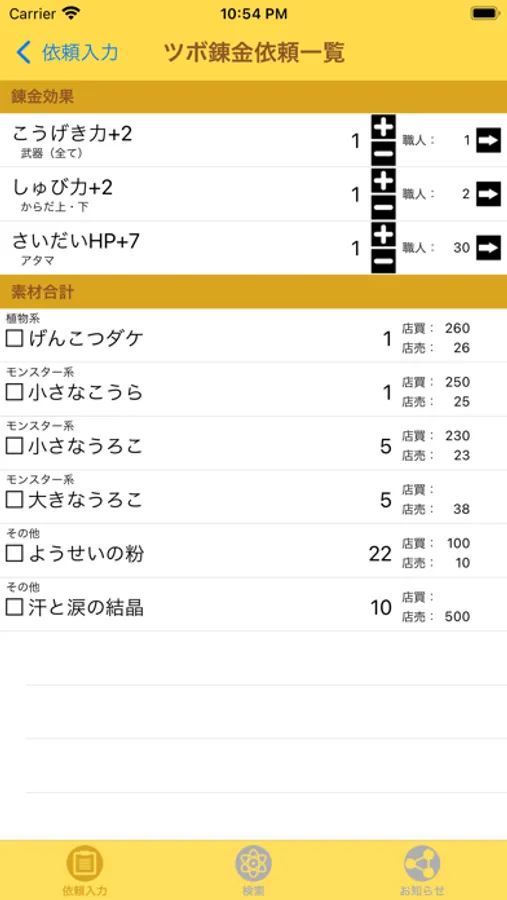 ・登録したツボ錬金の合計素材(レシピ)を確認