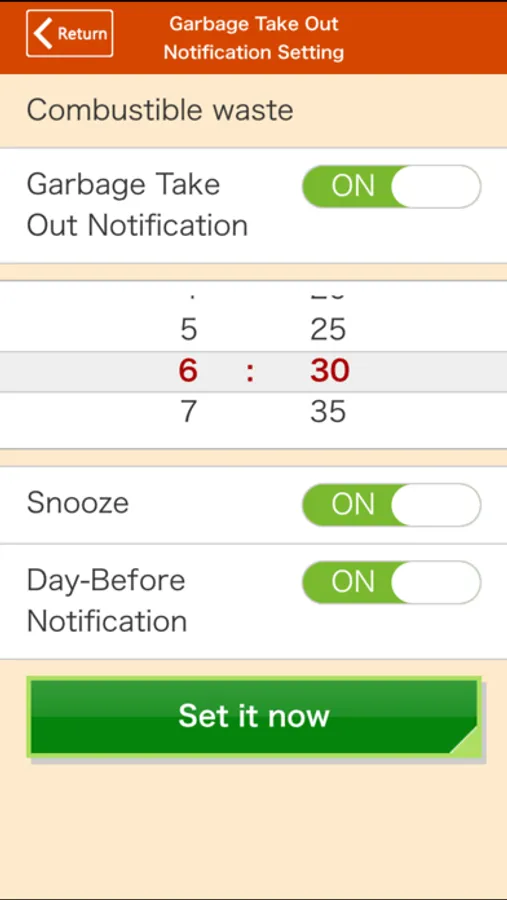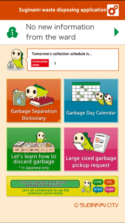 When all residents of Suginami Ward register for the garbage collection location they normally use, the collection schedule for that day and the following day is displayed on the top screen of the application. In addition to being able to view collection days on the Garbage Day Calendar, you can also even set a morning alarm to alert you for each type of garbage being collected.