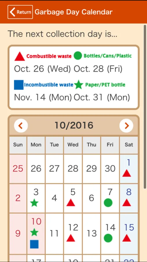 「waste disposing expert」 is an application you can use to easily obtain information about garbage and other natural materials, anytime you want. By letting you know the collection days for garbage and natural materials, you can avoid forgetting to put your garbage out and other problems. We are aiming for improvements in garbage disposal etiquette. Please do make use of it.