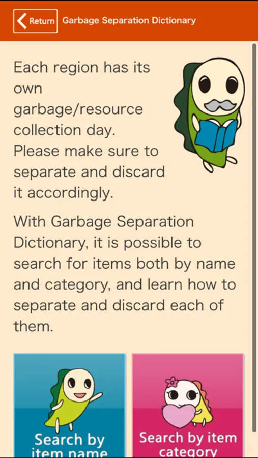 With "search by item," you can search from the names of over a thousand items. With "search by garbage type," you can find explanations of how to dispose of each type of garbage and/or natural materials.