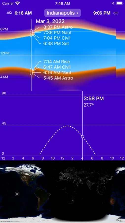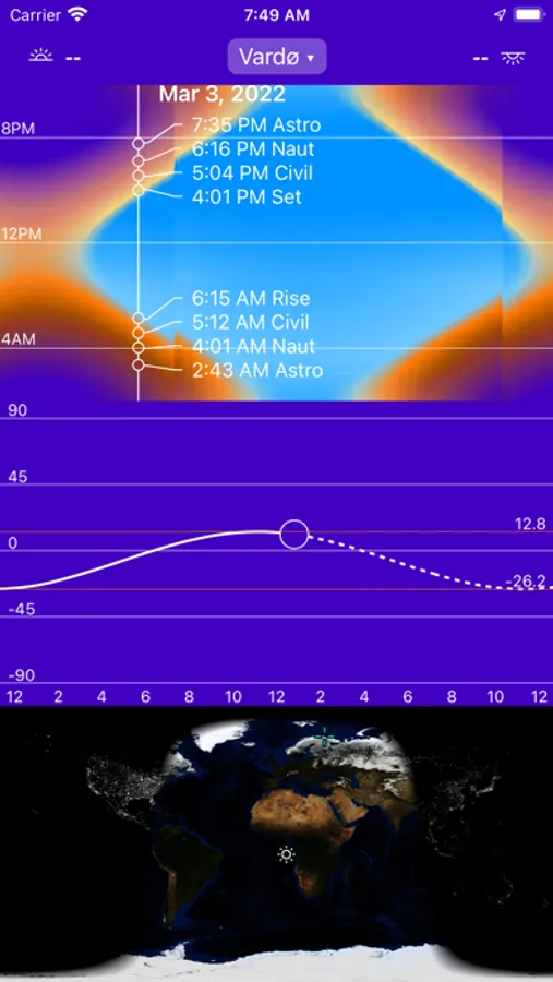 • Calculates the sun rise and set, as well as civil, nautical, and astronomical twilight times for your current location, or any location across the globe.