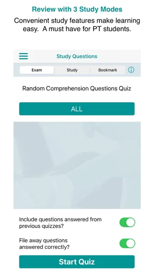 •Study/Exam/Bookmark modes are available for NPTE-style review questions.