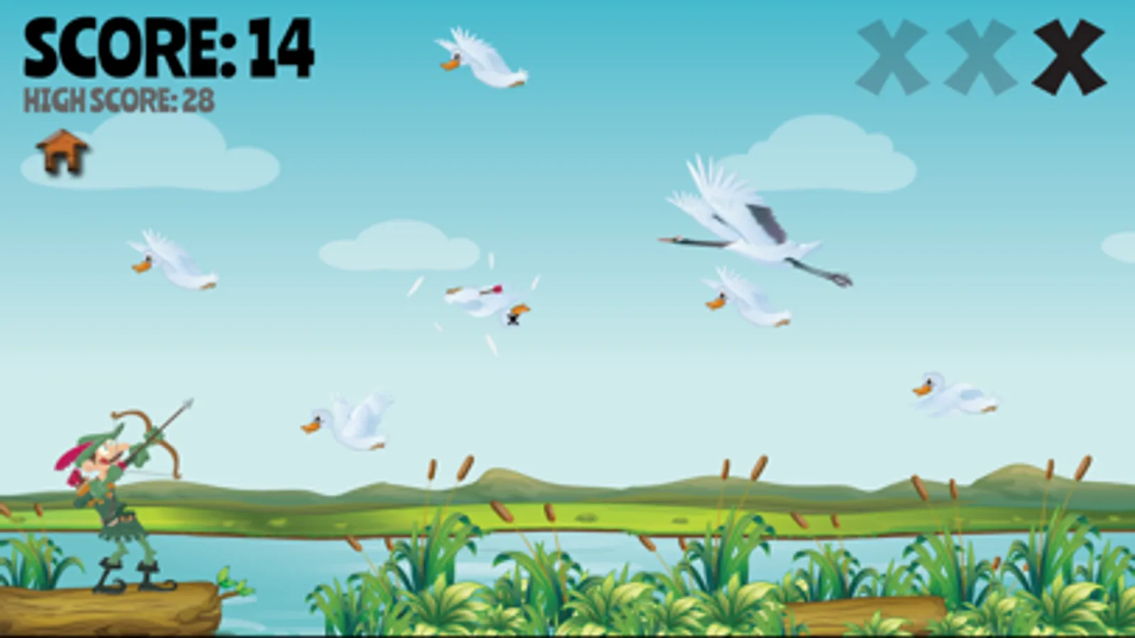 Duck Bow Hunt is a classic arcade duck shooting game using a bow and arrows. The goal of the game is to shoot the ducks before they go off the left side of the screen. If you let a duck get away or shoot a crane you will get an “X” and once you get three the game is over. Touch the screen to shoot an arrow. The closer you touch to the hunter the less powerful the shot.