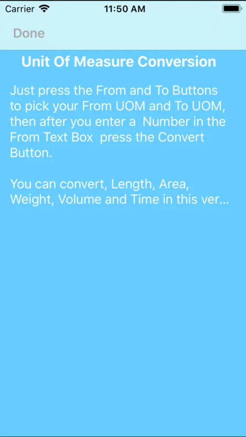 You can convert, Length, Area, Weight, Volume and Timein this version.
