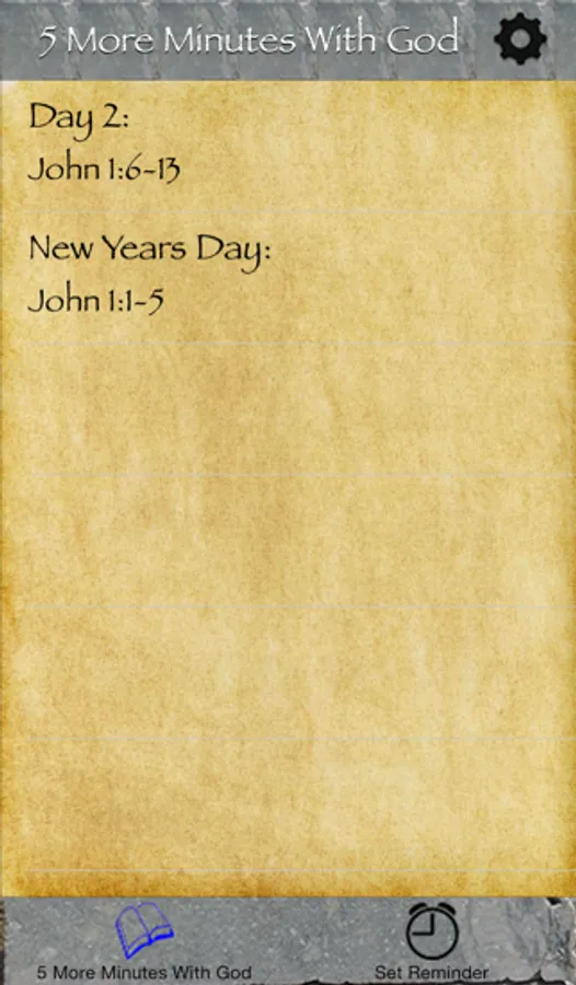 Each day, a new set of verses and devotional thought will become available to you. Didn't get the app downloaded on day 1? No worries, no matter when you download the app, it will start you off with day 1, to keep you from feeling overwhelmed trying to catch up. Should you want to catch up, just go into settings, and pick a day leading up to the current day of the year. (Ex., if you get the app on March 16, you can let it add day by day starting with 1, or advance it as far as March 16, and it will add the 17th the next).