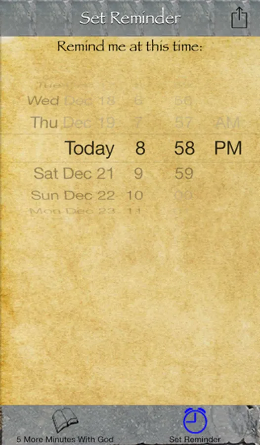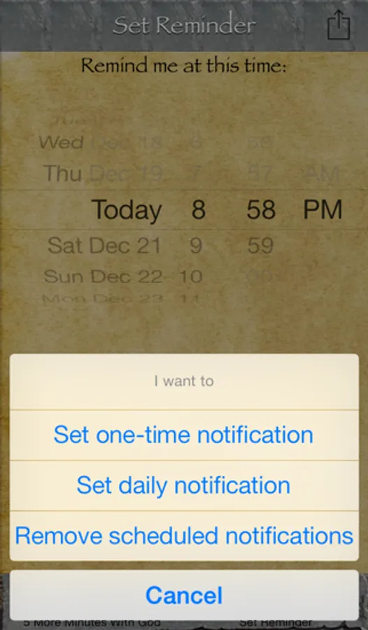 You may also schedule a reminder to open the app and read. These reminders may be a one-time only event, or can be set to Repeat daily, always reminding you via Alert, Banner, or simply in the Notification Center that you need to read that day.