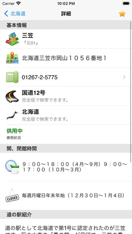 9、駅の基本情報(駅番号、駅名、所在地、電話番号、所在道路、所在都道府県、使用状況)、開閉館時間、道の駅紹介、施設内容などの情報を備えています。