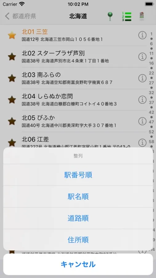 8、「駅番号順」、「駅名順」、「道路順」と「住所順」四つの表示順番があります。