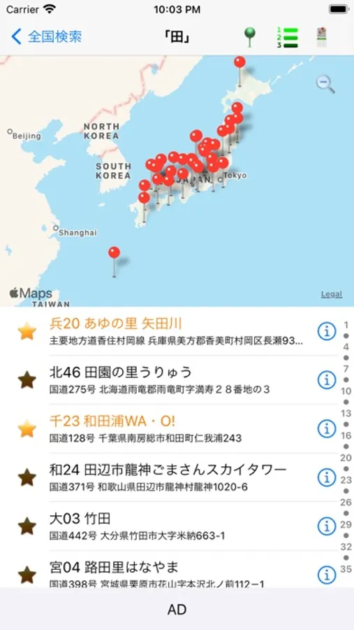 4、県内での気に入り情報、或は全国の気に入り情報検索も可能です。 (気に入り機能は有料バージョンのみ)