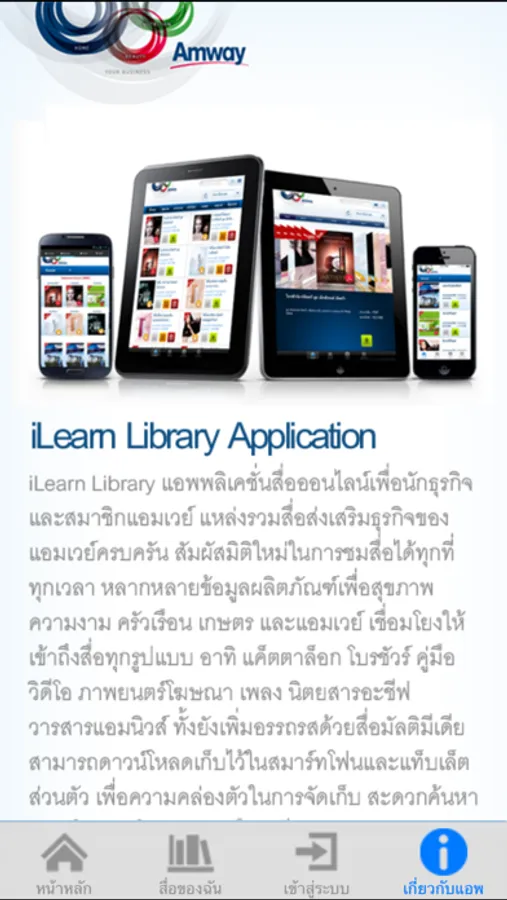 iLearn Library แอพพลิเคชั่นสื่อออนไลน์เพื่อนักธุรกิจและสมาชิกแอมเวย์ แหล่งรวมสื่อส่งเสริมธุรกิจของแอมเวย์ครบครัน สัมผัสมิติใหม่ในการชมสื่อได้ทุกที่ทุกเวลาหลากหลายข้อมูลผลิตภัณฑ์เพื่อสุขภาพ ความงาม ครัวเรือน เกษตร และแอมเวย์ เชื่อมโยงให้เข้าถึงสื่อทุกรูปแบบ อาทิแค็ตตาล็อกโบรชัวร์คู่มือวิดีโอภาพยนตร์โฆษณาเพลง นิตยสารอะชีฟ วารสารแอมนิวส์ ทั้งยังเพิ่มอรรถรสด้วยสื่อมัลติมีเดียสามารถดาวน์โหลดเก็บไว้ในสมาร์ทโฟนและแท็บเล็ตส่วนตัว เพื่อความคล่องตัวในการจัดเก็บสะดวกค้นหาและนำเสนอข้อมูลอย่างมืออาชีพ