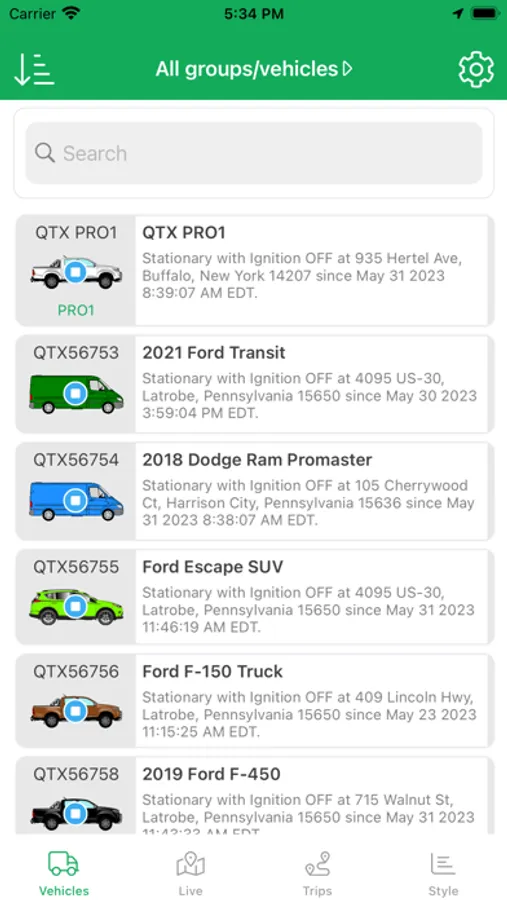 - Vehicle list, to give a summary of all the vehicles to which the user has access, and their present location.