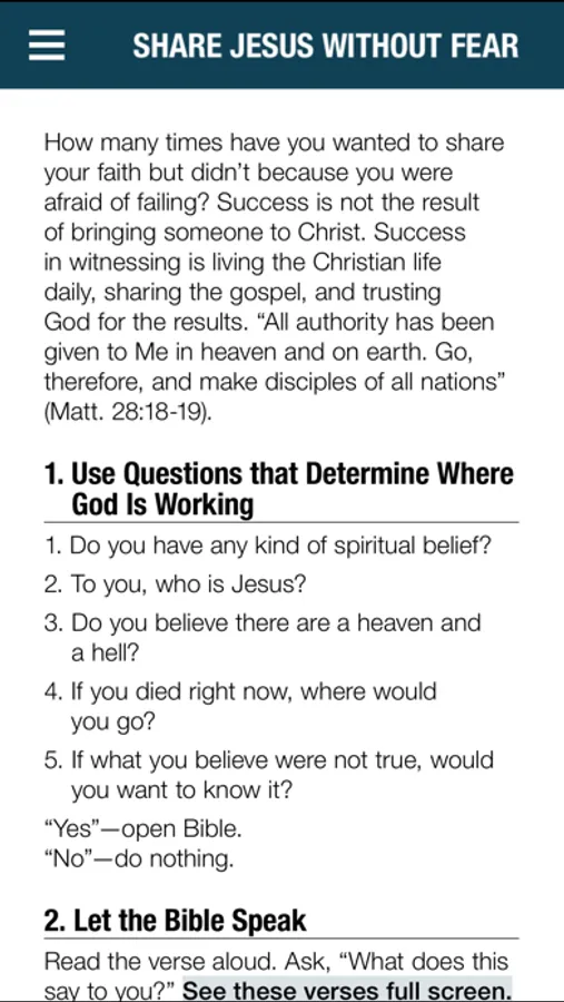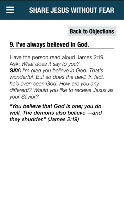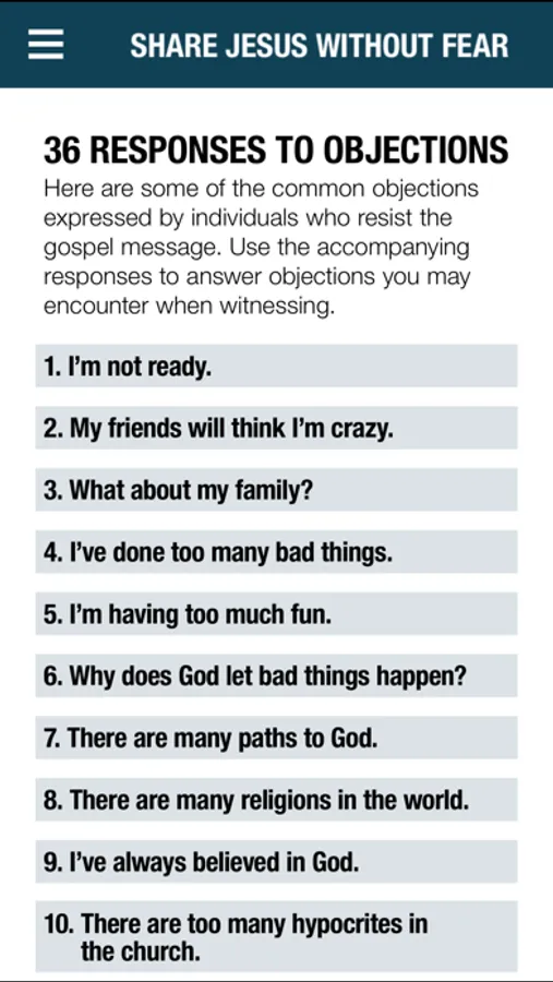 A simple, relational way to witness about Jesus Christ. Depending on God’s power for the results, this approach lets the Bible speak for itself. Believers can access the Bible by touch to easily navigate a witnessing conversation in everyday situations. This app includes 36 responses with scriptures to help answer the most common objections a nonbeliever may have about the miraculous power of God to change and save lives through a personal relationship with Jesus Christ.