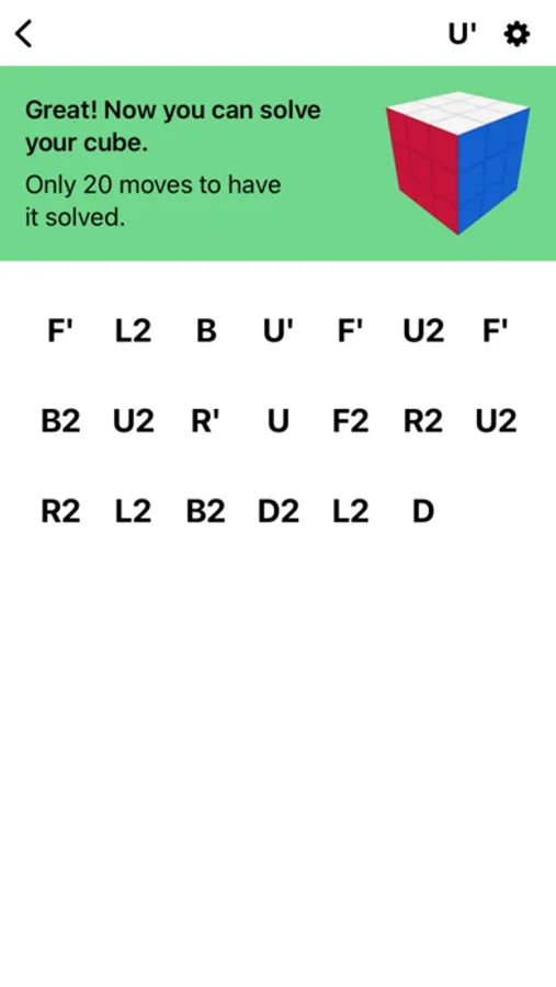 This app will help you to solve your cube 3x3. The best algorithms will find the optimal solution, with 22 moves or less!