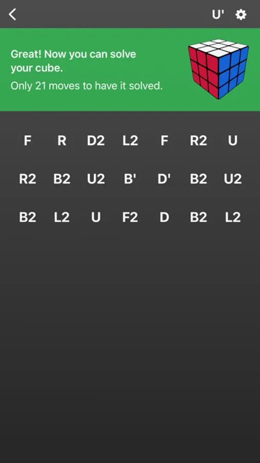 This app will help you to solve your cube 3x3. The best algorithms will find the optimal solution, with 22 moves or less!
