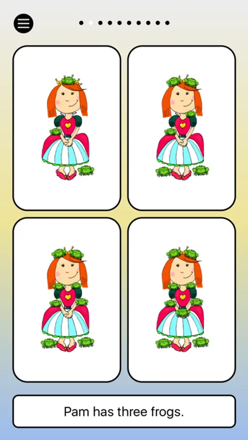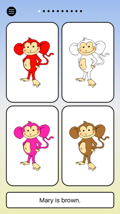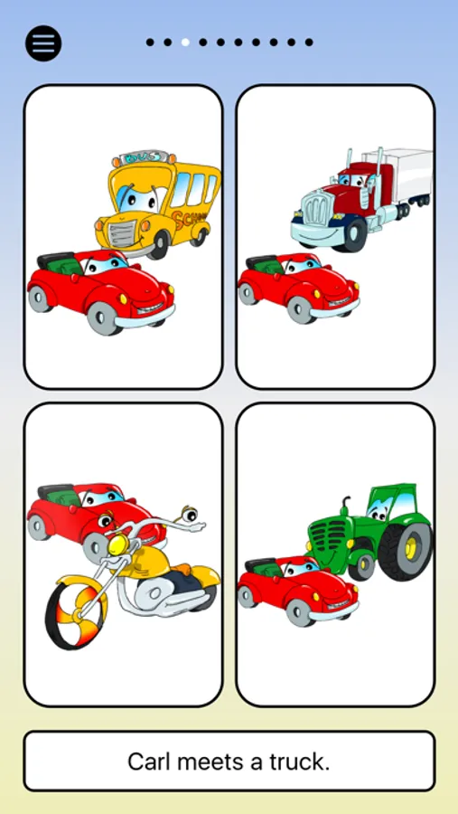 "ABC - Learn to read" contains 240 pictures and sentences that are specially created for this app and together form a interactive reader On each page one sentence and four images are displayed and the task is to find the picture that matches the text. If the answer is wrong a new text will be presented randomly so that the kids cannot just guess the correct answer. Besides the ability to read simple sentences the app also practices comprehension of the content such as colors, numbers, prepositions and geometric shapes.