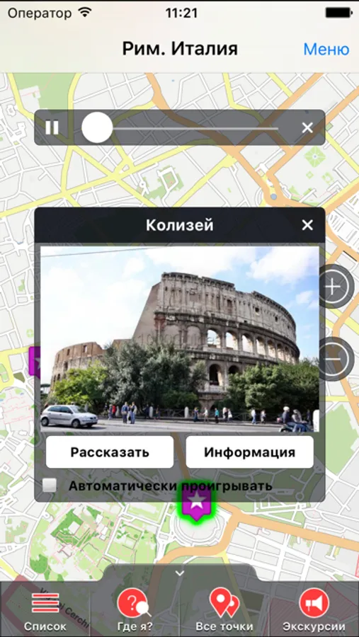 ● АУДИОГИД ПО РИМУ. Рассказы аудиогида озвучены профессиональным диктором. Слушайте рассказы не отвлекаясь от осмотра достопримечательностей и не теряя время. Не стоит портить зрение, читая на ходу текст на небольшом экране.