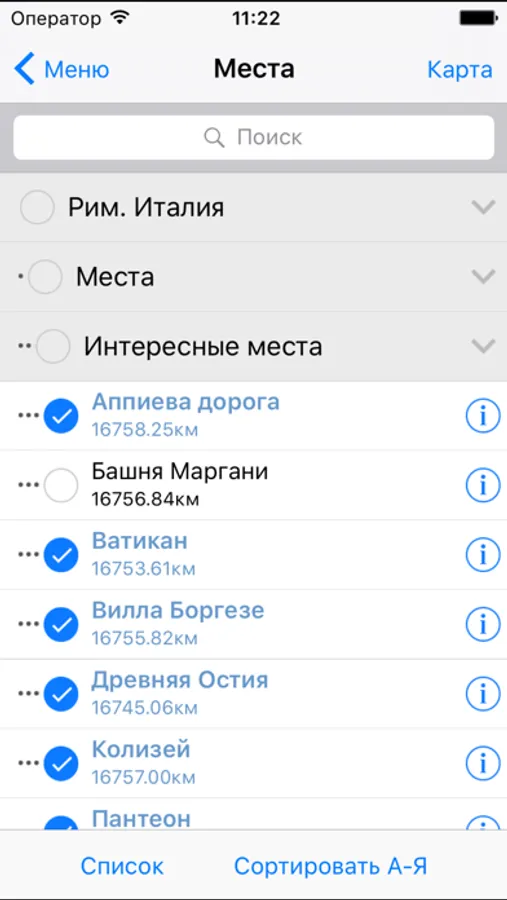 ● ПРОГУЛКИ ПО РИМУ. В нашем путеводителе очень просто составить свой собственный план прогулки по Риму, отметив в каталоге нужные места, которые сразу будут отображены на карте. При этом остальные объекты вы можете временно убрать с карты.