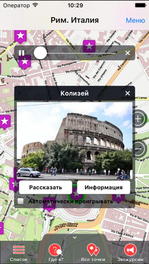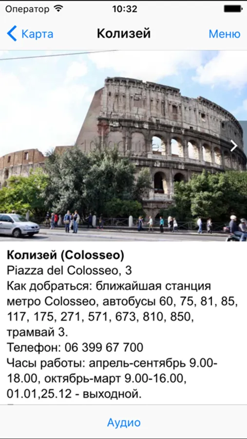 ● АУДИОГИД ПО РИМУ. Рассказы аудиогида озвучены профессиональным диктором. Слушайте рассказы, не отвлекаясь от осмотра достопримечательностей и не теряя время. Не стоит лишний раз портить зрение, читая на ходу текст на небольшом экране.