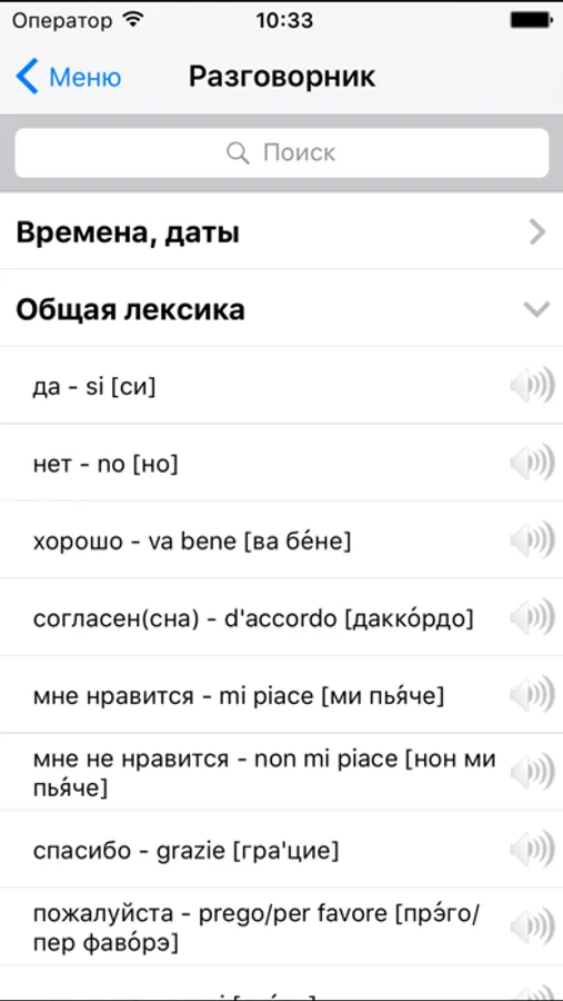 ● КРАТКИЙ РАЗГОВОРНИК. Разговорник поможет при необходимости быстро подобрать нужное слово. К сожалению в текущей версии разговорник не предоставляет возможность прослушивать произношение слов и фраз (динамик не активен).