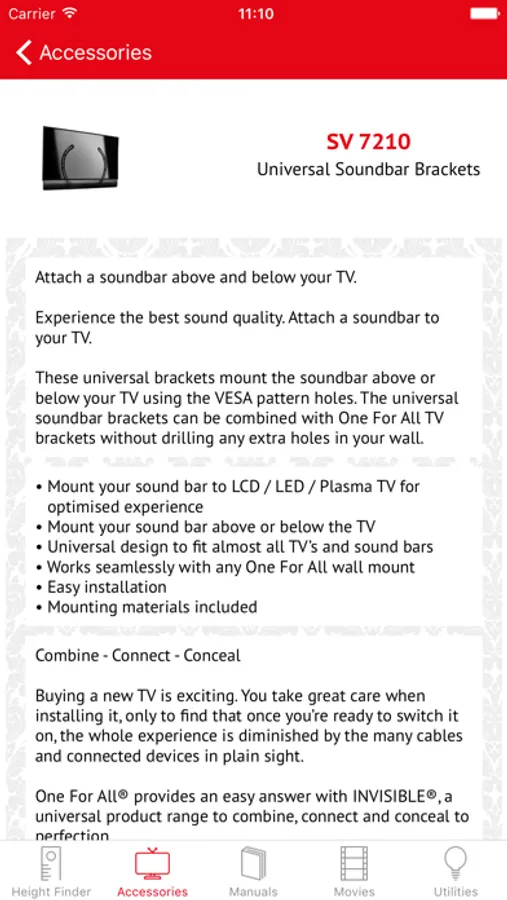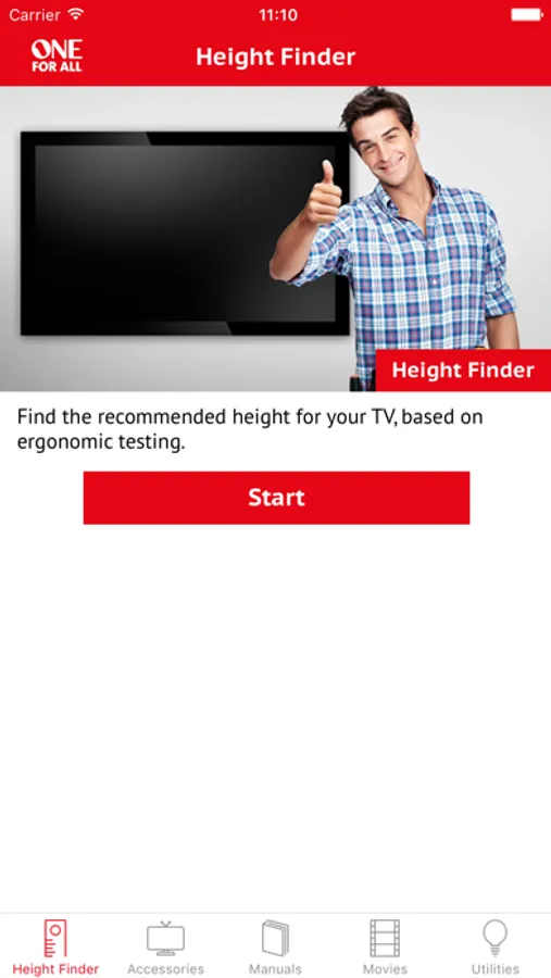 This app provides you with many tools to install your One For All wall mount in the best possible way. One For All offers a wide range of wall mounts, covering all movement types, screen sizes and VESA sizes.