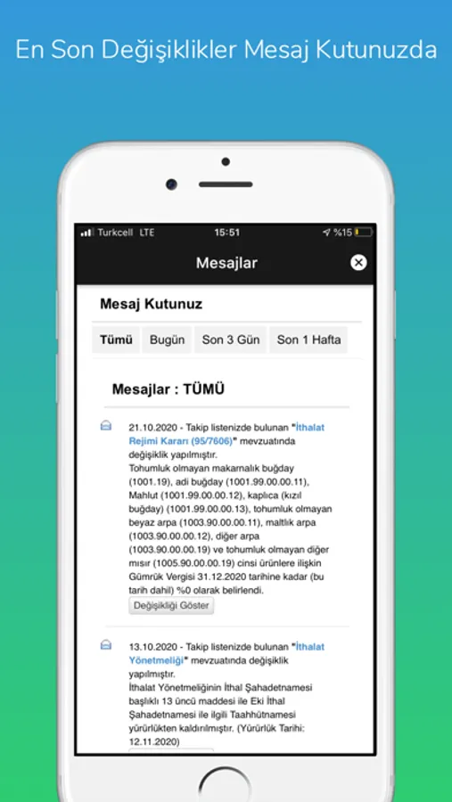 Programı IOS cihazınıza yükledikten sonra, internet bağlantınız varsa, dış ticaret ile ilgili gün içerisinde oluşan ve Mevzuat.Net sistemine dahil edilen tüm gelişmeler, cihazınıza ulaştırılacaktır.