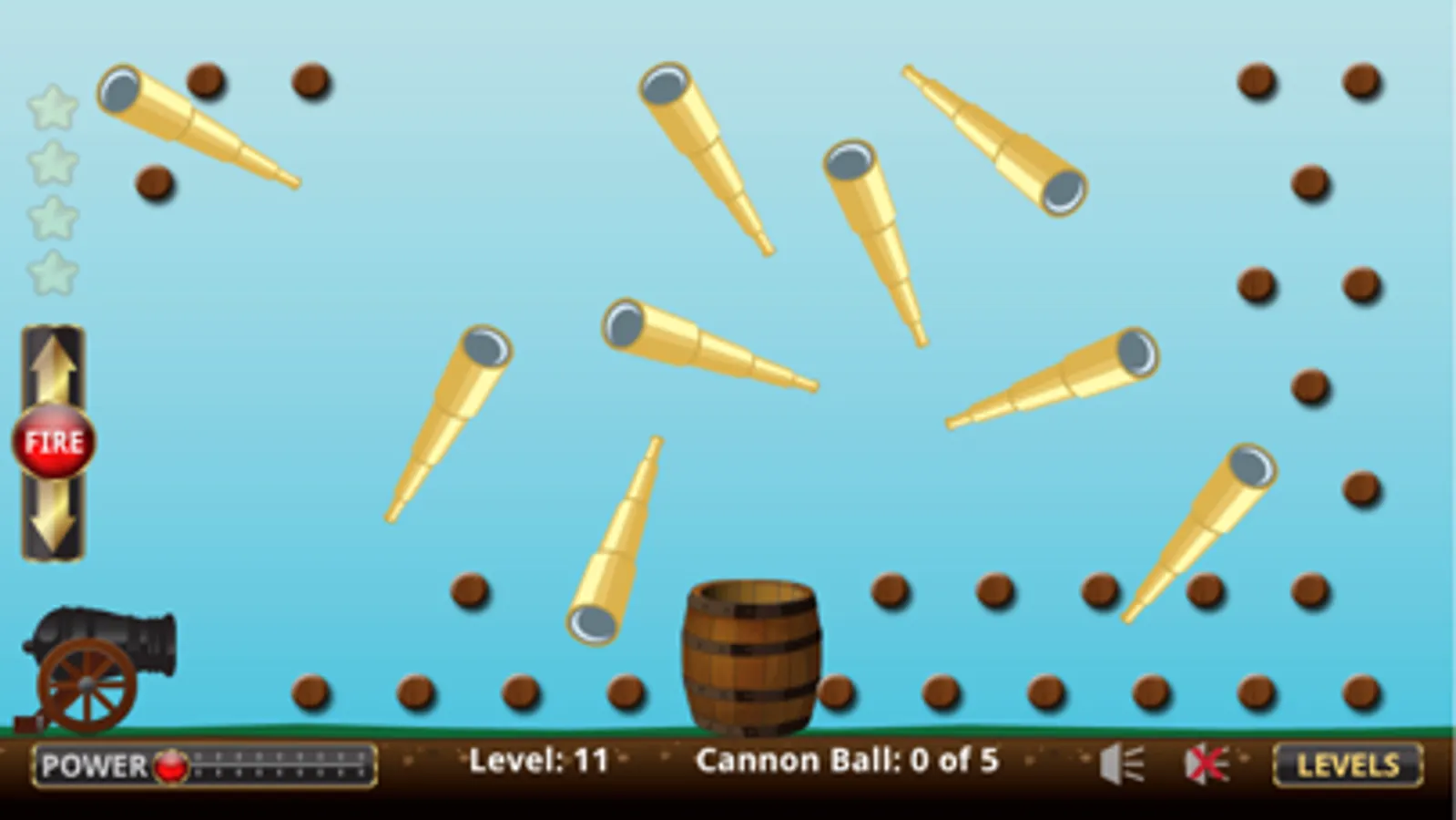 Cannonball Commander is a fun pirate themed game where you shoot a cannonball into a barrel. Cannonball Commander is fun, challenging, and addicting to play. Use the up and down arrows to aim the cannon and then touch the "Fire" button to shoot. In some levels you will need to adjust the amount of power you use to shoot the cannon. The goal of the game is to get the cannonball into the barrel to unlock the next level. The levels have objects that can effect the cannonball.