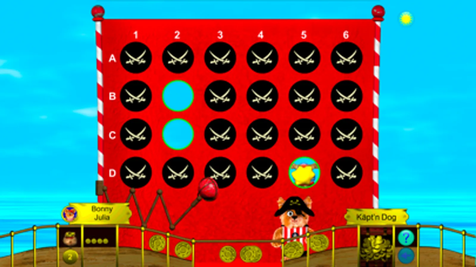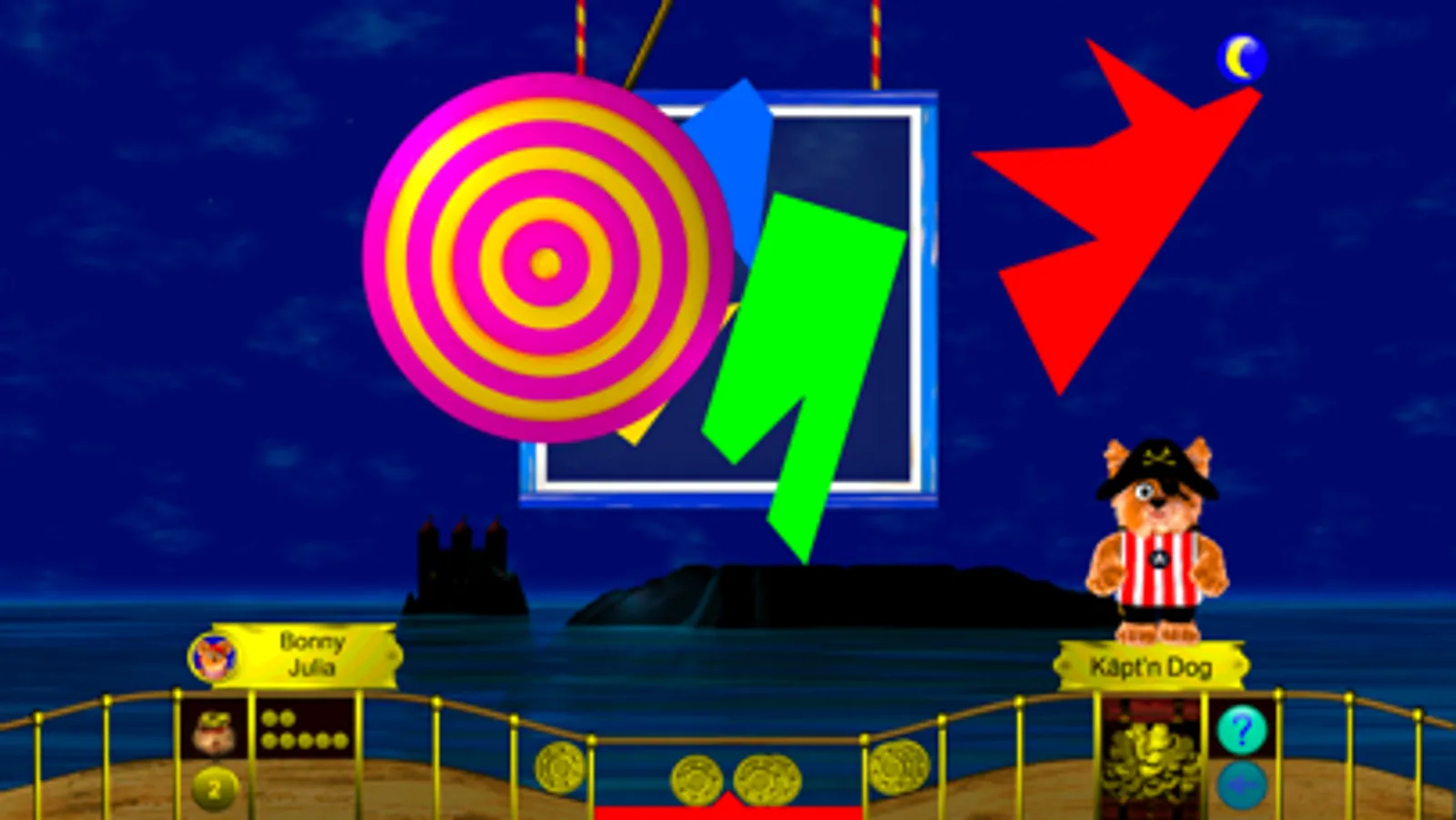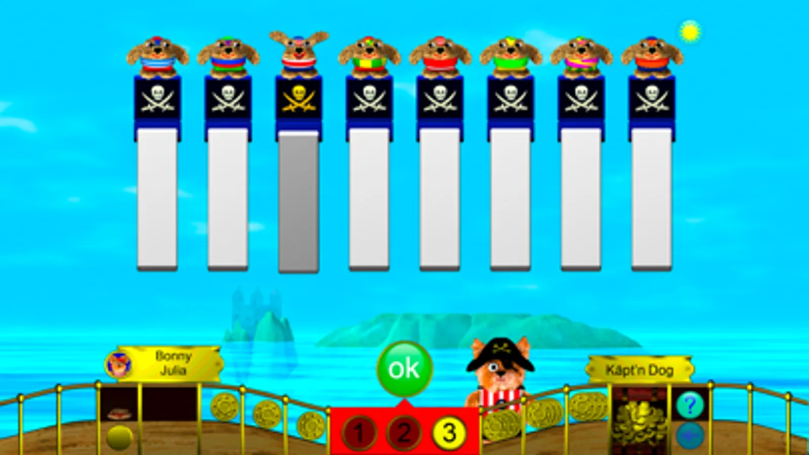Captain Dog opens his treasure chests and sells the most beautiful pieces. The players need gold coins which can be won in different games. First, the players may choose a game, then it‘s Captain Dog’s turn. This guarantees that not only the favorite games are selected. Depending on the level of difficulty, players can win 1, 2 or 3 coins for any task which is solved correctly. The more difficult the task the higher the profit. But watch out! Whoever makes a mistake unfortunately has to watch Captain Dog grab the gold coins! The players get an immediate feedback on whether the task was solved correctly or incorrectly and the gold coins will be distributed accordingly.