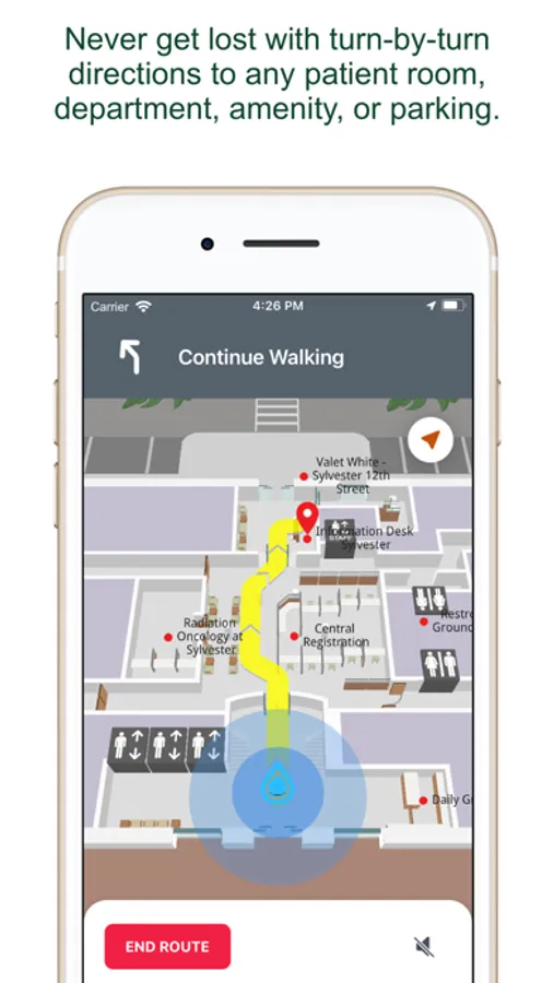 • Get step-by-step indoor guide to patient’s room, department, or amenity