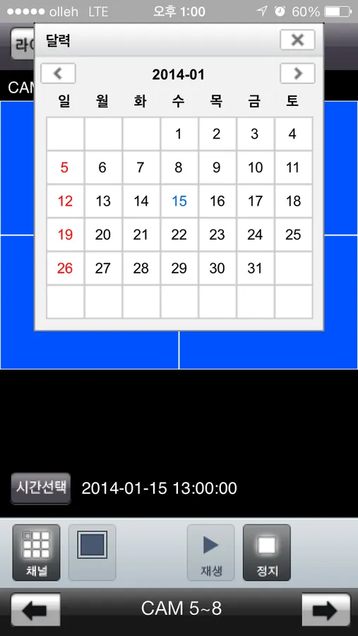 2) 달력화면에 녹화표시된(파란색) 날짜 선택