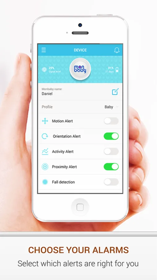 MonBaby Smart Button is a smart baby movement and activity monitor that attaches anywhere on typical baby clothing. It is a wearable sensor that tracks your child's movements and activity patterns on a smartphone app. It does this by sending motion data to parents smartphones over Bluetooth Low Energy. Parents can views their baby activity stats and receive alerts about important events that our application detects.