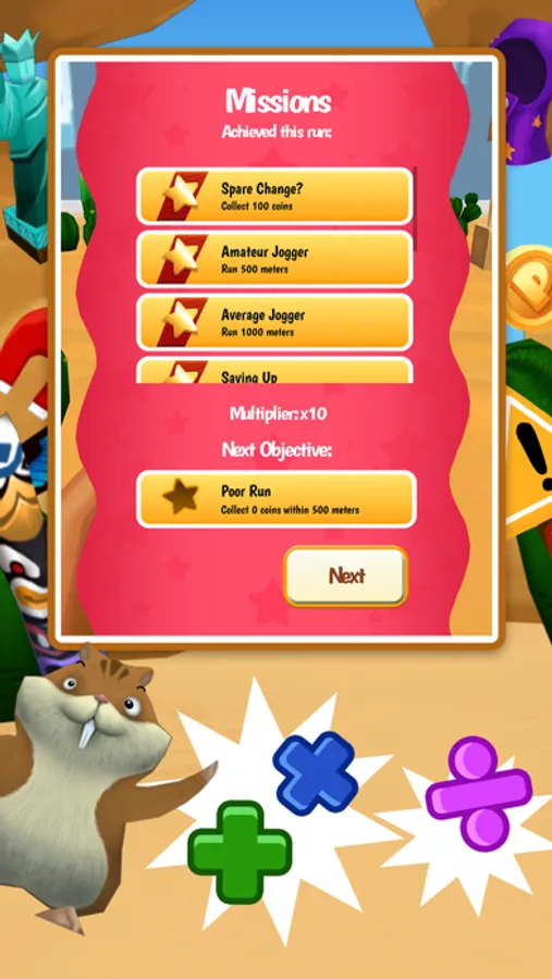 Math Run poses arithmetic questions at key points to allow the player to advance or earn specific rewards. Math Run includes five playable characters, which determine the difficulty and type of math questions presented during gameplay.