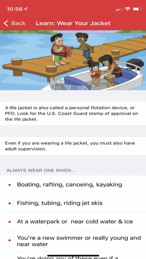 Swim helps the entire family by focusing on water competency which involves a combination of being water smart, having water safety and survival skills, and knowing what to do in a water emergency. This app teaches users the layers of protection to prevent drowning and about risks around water at home, in other environments, such as lakes, rivers and oceans, as well as in risky situations, such as group gatherings involving water.