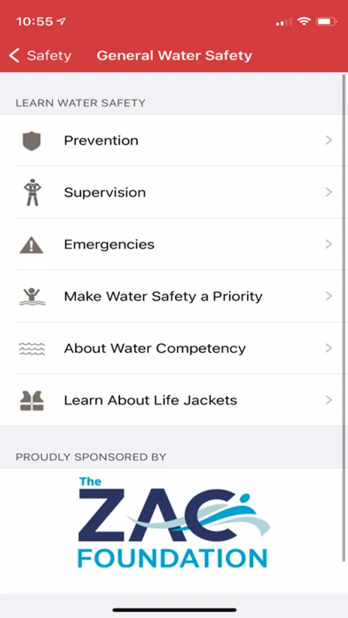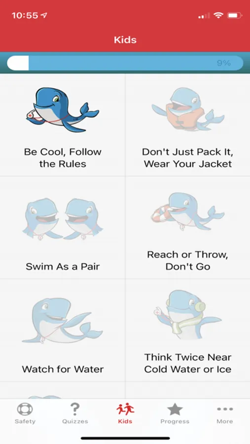 - A Kids section with water safety messages using memorable phrases to reinforce learning.