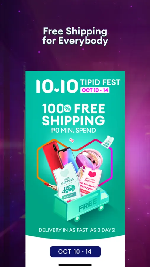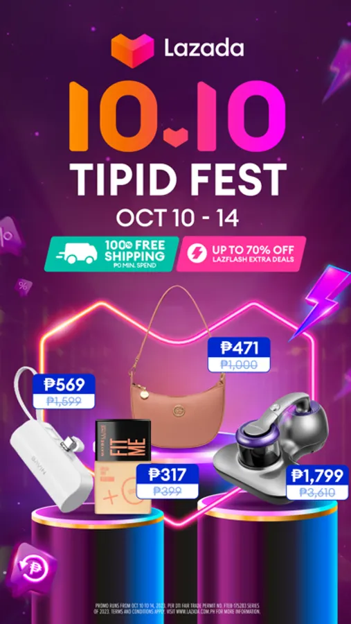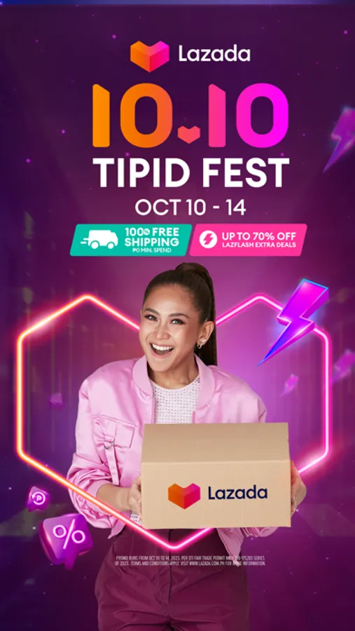 Get 100% Free Shipping with P0 minimum spend and No Cap! Enjoy Fast delivery & get your orders delivered within three days, alongside numerous vouchers and Cashback! Get up to 70% off on LazFlash Extra Deals this Oct 10-14, and avail exclusive vouchers and Up to P1000 Cashback through your Lazada app. Have a blast this 10.10 Tipid Sale with Lazada!