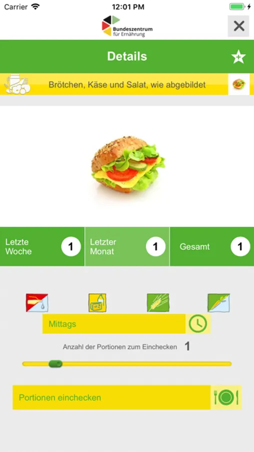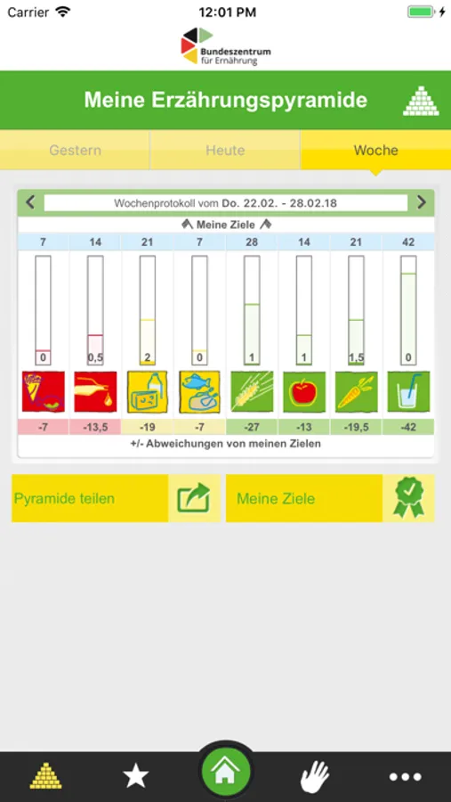 Die „eingecheckten“ Lebensmittel werden automatisch in die Ernährungspyramide des BZfE einsortiert und in ein Wochenprotokoll übertragen; denn nicht jeder Tag muss perfekt sein, sondern die Woche zählt.