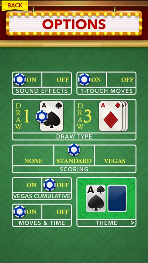Draw 1 or Draw 3 Solitaire with limited passes through the deck when Vegas scoring is enabled and unlimited passes when standard scoring is enabled. We don't recommend playing Vegas Draw 1 unless you love losing.