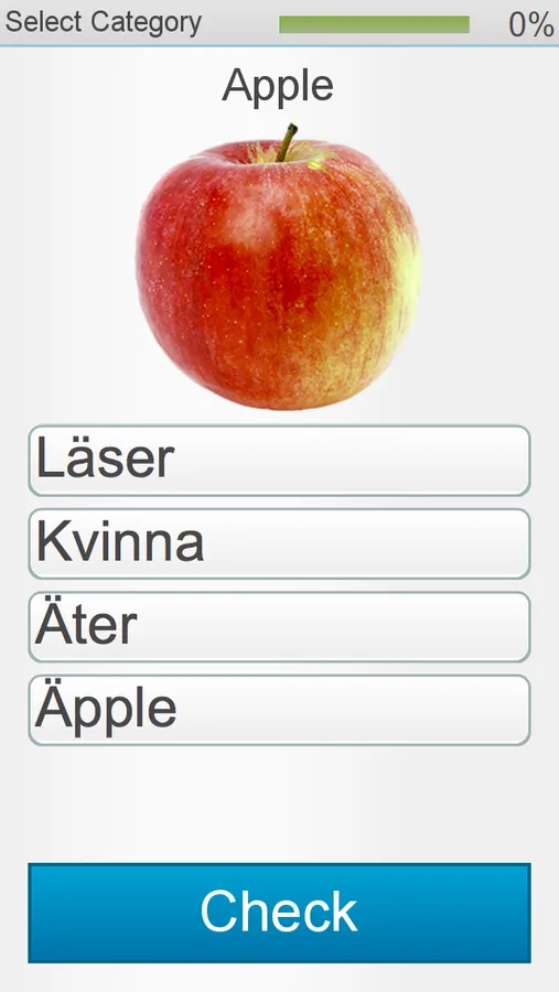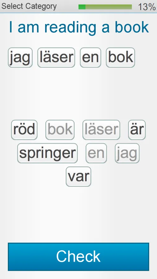 Learn Swedish by recognizing words and images, finding the missing word, completing sentences and building sentences.