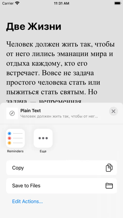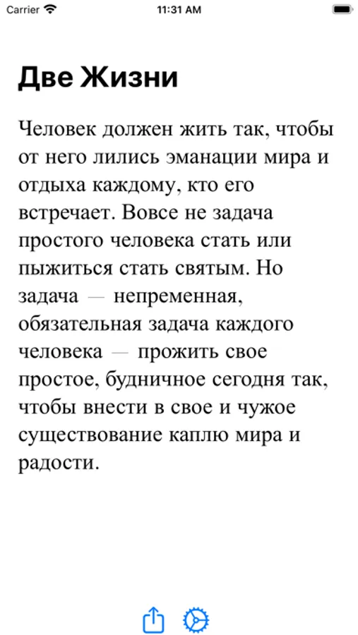 Эта программа предлагает цитаты из книги К. Е. Антаровой "Две Жизни", написанной в середине ХХ века. Чтобы увидеть следующую, случайно выбранную цитату, просто проведите пальцем по экрану.