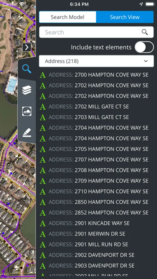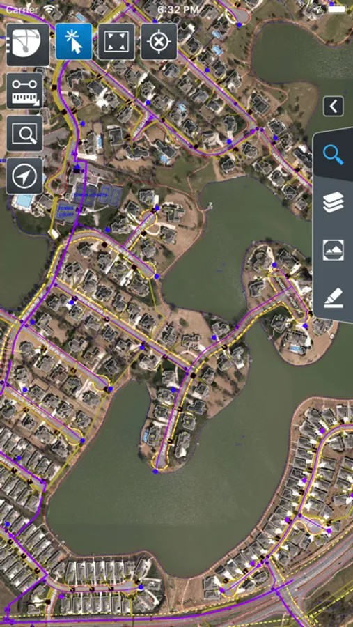 Bentley Map Mobile supports a simple interface using common gestures such as pinch to zoom, swipe to drag, and touch to select. The business properties of all mapping features are available for review. Users can quickly locate features using a free-text search function, and, once found, the selected feature is automatically zoomed to the view. The app is GPS-enabled, which simplifies the location of infrastructure in the field. If a network connection is available, an interface to Apple Maps can provide driving directions to the selected feature. The view display can be simplified by toggling features off and on, and a list of features in the current view can be quickly generated for active review.