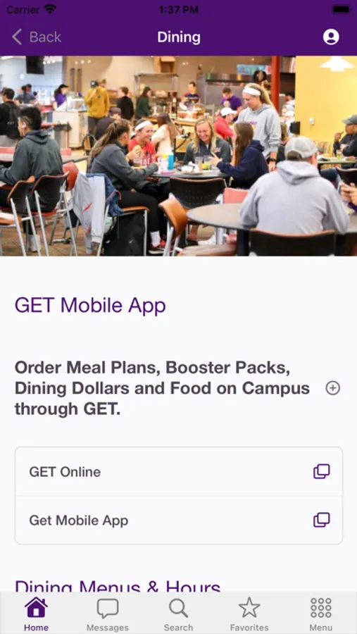 Dining—Check out daily menus at all dining locations. You can also order meal plans, booster packs, dining dollars and food on campus through the GET mobile app.