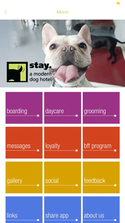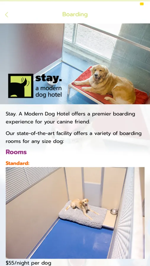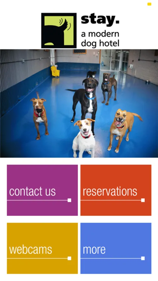 The Stay. app allows you to sign-up for Boarding, Daycare, Grooming, Transportation and other premium services, and also gives you access to some great specials and coupons. Best of all you get to watch your dog play via streaming webcams.
