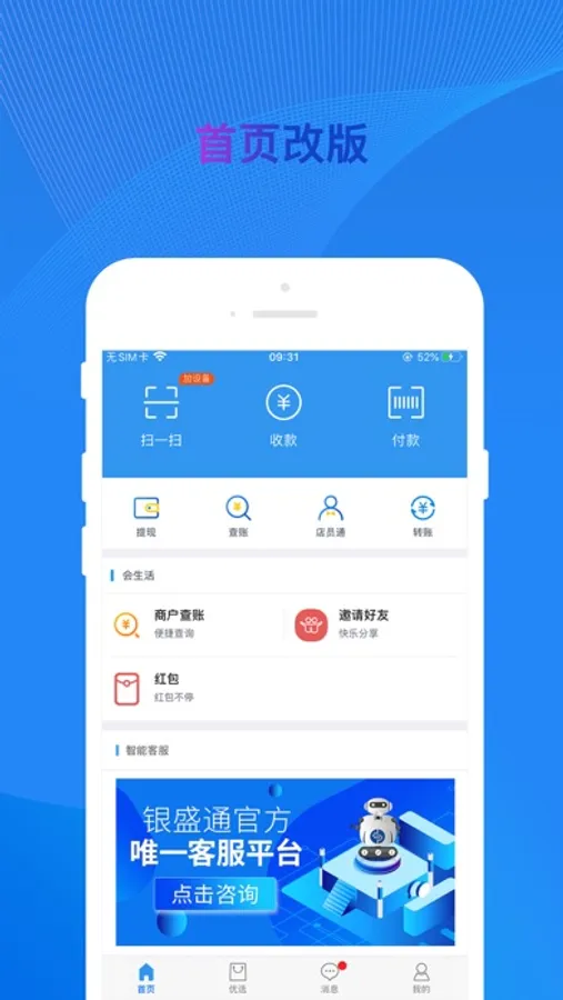 银盛通APP是银盛通专为商户打造的智慧经营管理APP,配合大蓝、小蓝、炫蓝、e-POS等移动支付产品,为商家提供全场景、多渠道、专业化的移动支付解决方案。打造“安全、可靠、简单、快捷”的一站式金融服务体验。