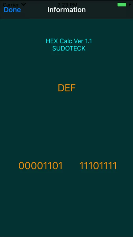 Tap Info button will show Version and the BINARY value which you enter on HEX area .