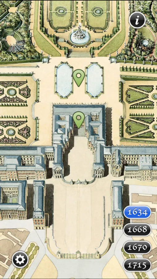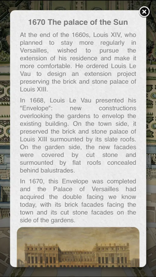 The principle is simple: having his phone at the heart of the Royal Court, at the foot of the Chapel or on the terrace gardens, visitor can see the palace at the time of his choice. His phone becomes a real window into the past by superimposing the palace today and the palace of Louis XIV.