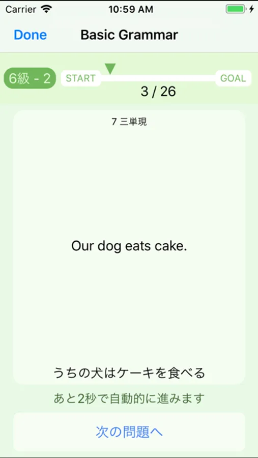 - 時間が経つと、自動でどんどん次の問題にすすむので、覚えた例文は正解ボタンを押して行きましょう。